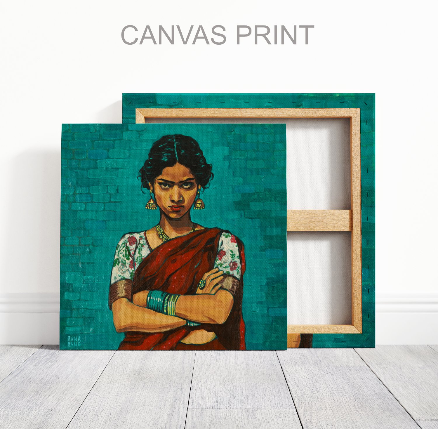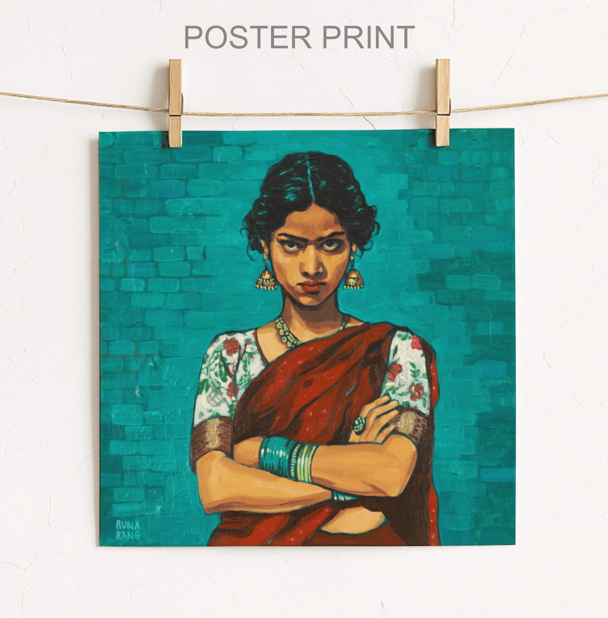 Originally painted in September 2025 with acrylics on a 12" x 12" linen panel, with sparkly paper accents on her sari, and a brick wall made from layers of paper, tissue and paint.