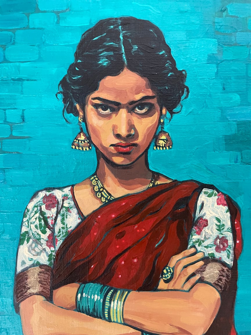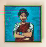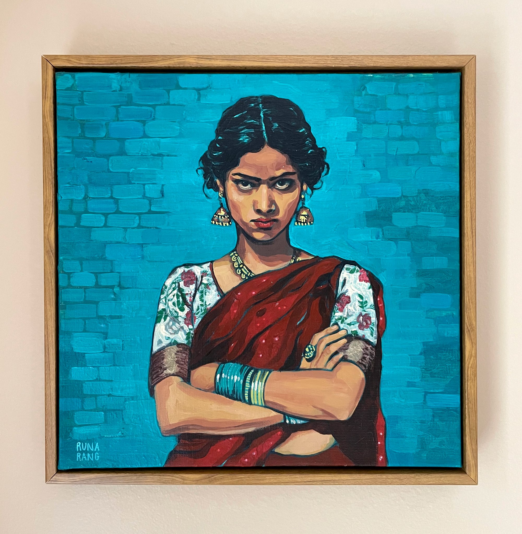Acrylics on a 12" x 12" linen panel, with sparkly paper accents on her sari, and a brick wall made from layers of paper, tissue and paint. Light brown frame included!