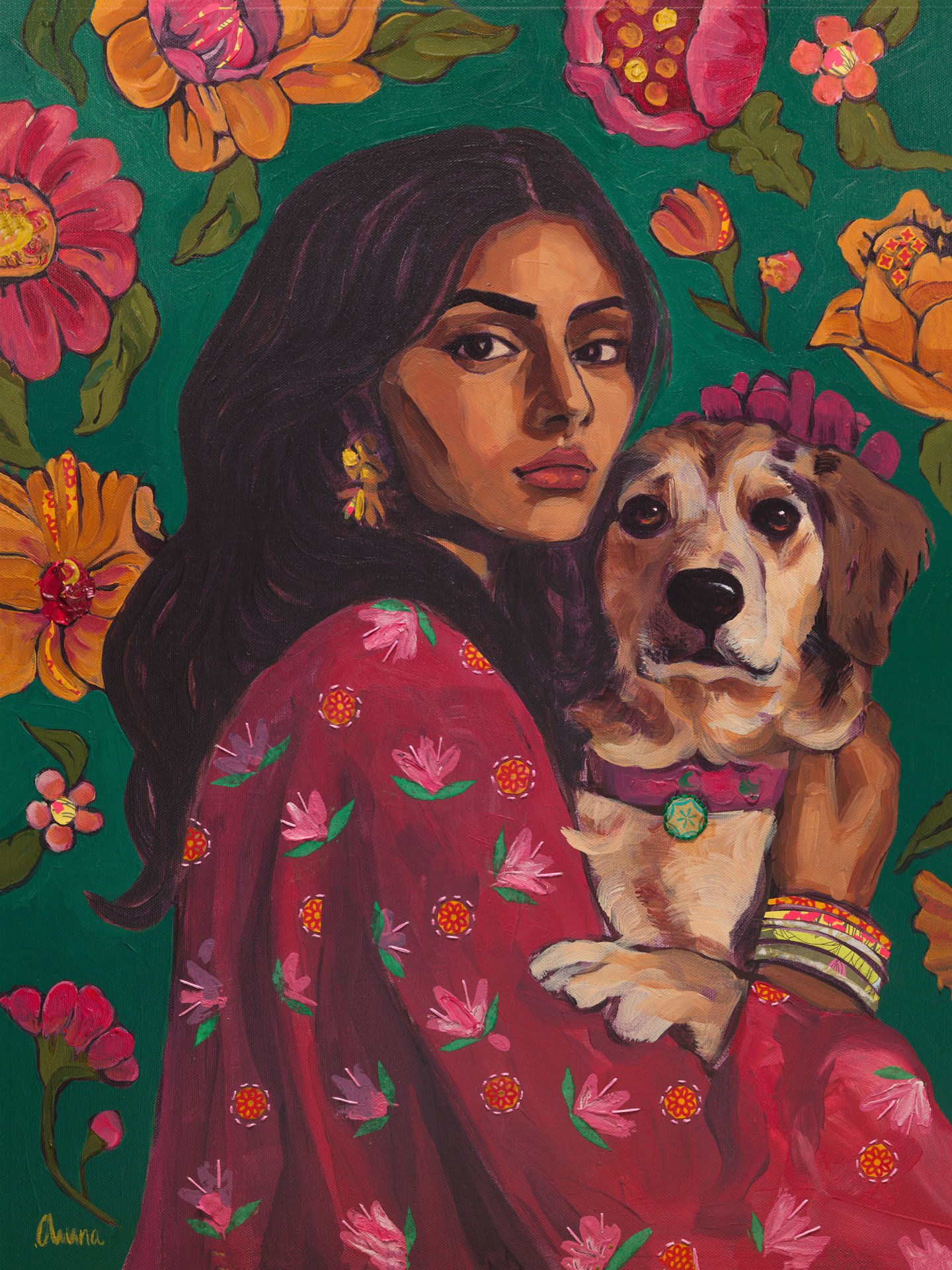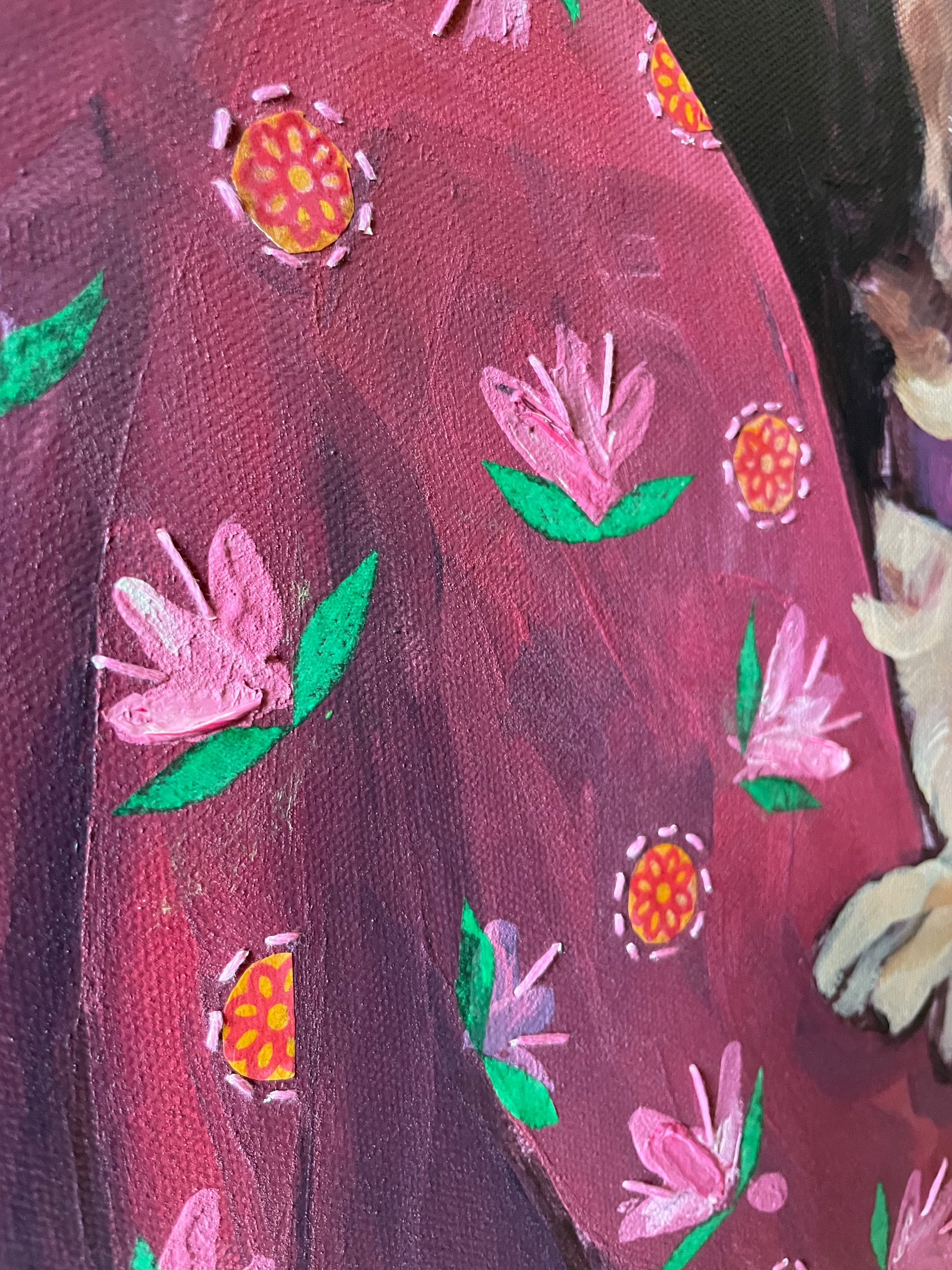 This painting honors the relationship between a powerful woman and her best friend. The color palette is inspired by some of my mother's lovely saris. I have tried to bring it all together with texture from cut paper, embroidery and thick daubs of layered paint.
